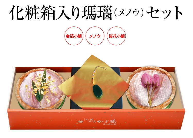 ■内容量:金箔入り小鯛笹漬 85g×1個、桜入り小鯛笹漬 85g×1個、若狭メノウのストラップ×1個