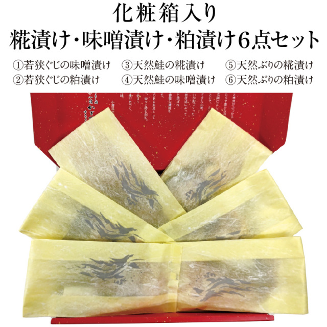 ■内容量(製造時):若狭ぐじの味噌漬け60g×1 、若狭ぐじの粕漬け60g×1 、天然鮭の糀漬け60g×1 、天然鮭の味噌漬け60g×1 、天然ぶりの糀漬け60g×1 、天然ぶりの粕漬け60g×1