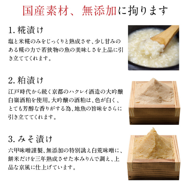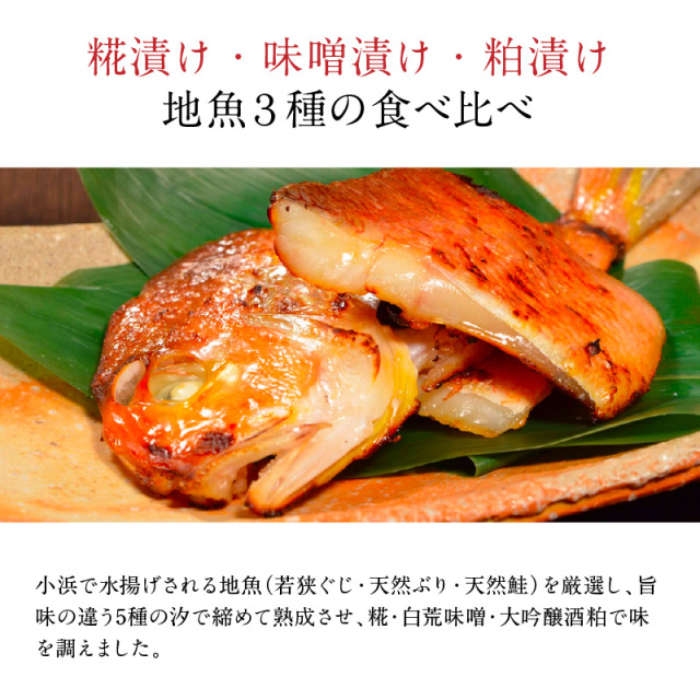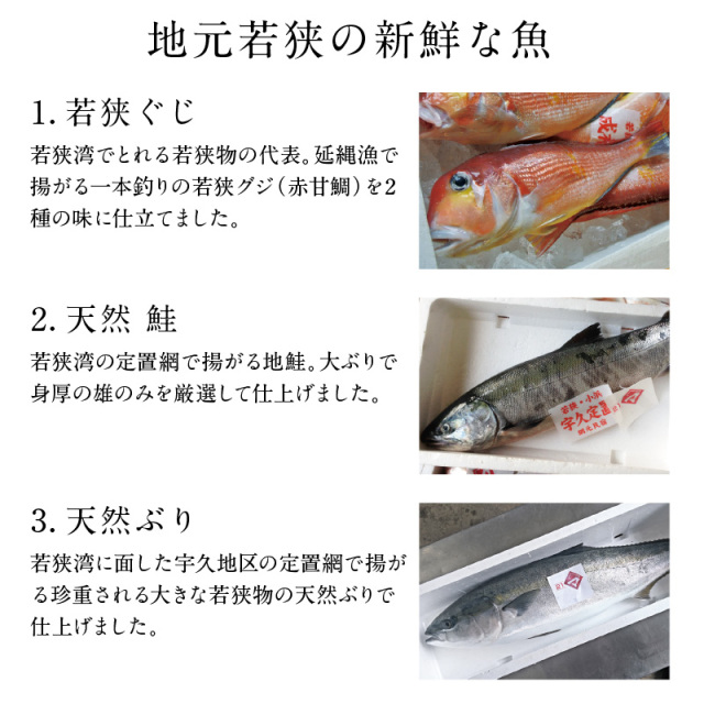 小浜で水揚げされる地魚(若狭ぐじ・天然ぶり・天然鮭)を厳選し、旨味の違う5種の汐で締めて熟成させ、糀・白荒味噌・大吟醸酒粕で味を調えました。