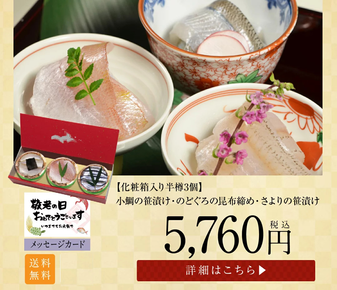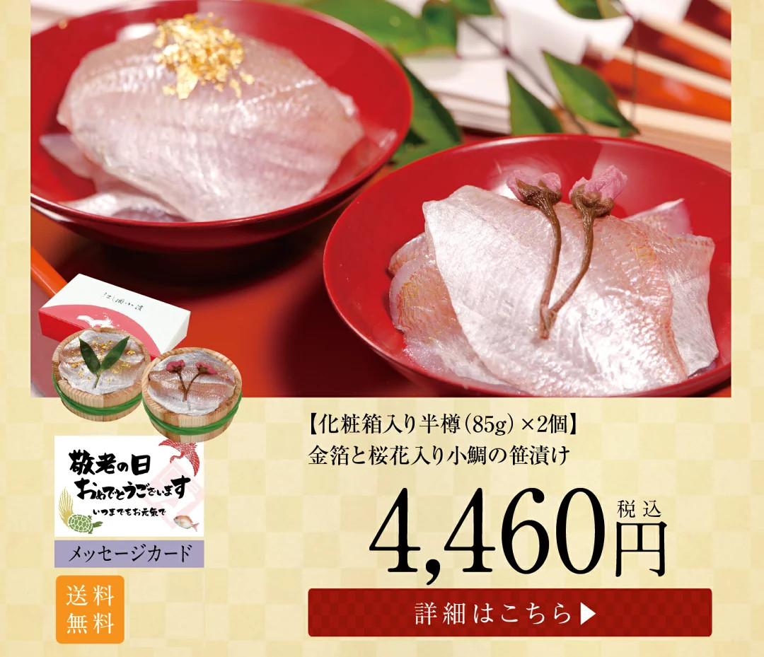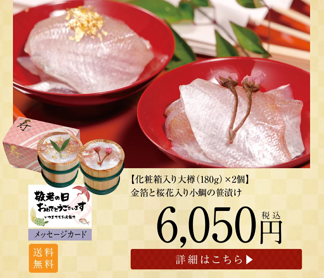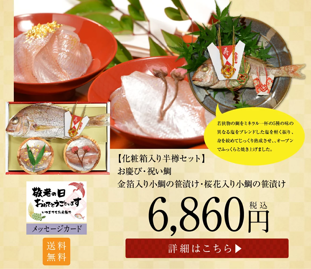 トップページ 2025年 敬老の日特集 表示切替: 写真のみ 説明付き 並び順: 標準 レビューの多い順 おすすめ商品順 新着商品順 値段の安い順 値段の高い順 名前:昇順 名前:降順 8件中1件~8件を表示 商品一覧 ギフト お取り寄せギフト お取り寄せ【半樽(85g)×1個 蒸し寿司×2個】小鯛笹漬・小鯛の蒸し寿司・サーモンの蒸し寿司【ささ漬け】【ささづけ】おつまみ お取り寄せ [_214525_] ¥5,500(税抜 ¥5,093) 申し訳ございません。只今在庫切れです。 ギフト お取り寄せ【半樽(85g)×2個+笹漬け寿司×1個】小鯛の笹漬け+のど黒の昆布締め+小鯛笹漬け寿司(蒸し寿司)【ささ漬け】【ささづけ】おつまみ [_214522_]【NE】 ¥5,750(税抜 ¥5,324) 申し訳ございません。只今在庫切れです。 ギフト お取り寄せ【半樽(85g)×1個 笹漬け寿司(蒸し寿司)×1個】小鯛笹漬・小鯛の笹漬け寿司(蒸し寿司)【ささ漬け】【ささづけ】おつまみ お取り寄せ [_214524_]【NE】 ¥4,500(税抜 ¥4,167) 申し訳ございません。只今在庫切れです。 【送料無料】贈り物 ギフト【冷凍】【半樽(85g×2個+焼き鯛)セット】お慶び・祝い鯛と金箔・桜花入り小鯛の笹漬けセット [_2151526_] ¥7,000(税抜 ¥6,481) 【送料無料】 贈り物 ギフト【冷凍】【化粧箱入り半樽(85g)×2個】金箔と桜花入り小鯛の笹漬け(ささ漬)[_211407_]【NE】 ¥4,570(税抜 ¥4,231) 【送料無料】 贈り物 ギフト【冷凍】【箱入り大樽(180g)×2個】金箔と桜花入り小鯛の笹漬け(ささ漬)[_211408_]【NE】 ¥6,050(税抜 ¥5,602) ギフト【送料無料】贈り物 ギフト【冷凍】【化粧箱入り半樽(85g)×3個】小鯛の笹漬け・のど黒の昆布締め・さよりの笹漬け[_215101_]【NE】 ¥6,200(税抜 ¥5,741) 送料無料 ギフト【送料無料】贈り物 ギフト【送料無料】【冷凍】【化粧箱入り半樽(85g)×2個】のど黒の昆布締め・小鯛の笹漬け[_214504_]【NE】 ¥4,780(税抜 ¥4,426) 送料無料 8件中1件~8件を表示