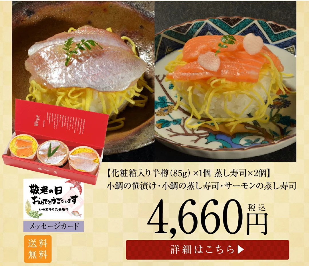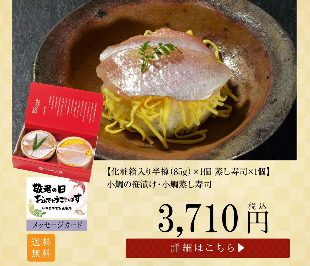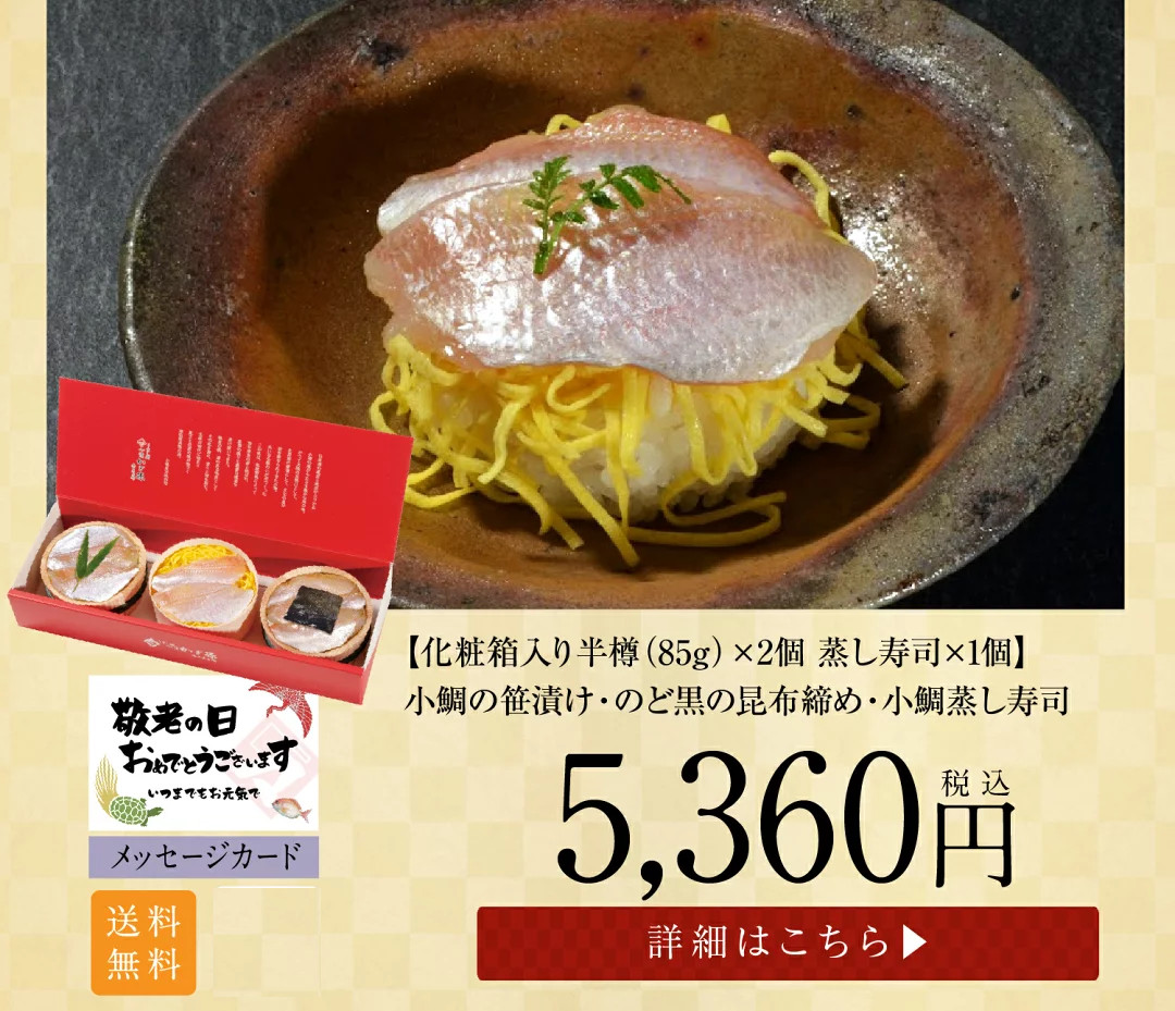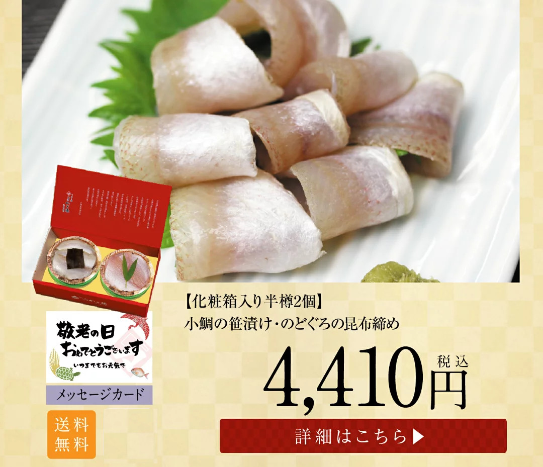 トップページ 2025年 敬老の日特集 表示切替: 写真のみ 説明付き 並び順: 標準 レビューの多い順 おすすめ商品順 新着商品順 値段の安い順 値段の高い順 名前:昇順 名前:降順 8件中1件~8件を表示 商品一覧 ギフト お取り寄せギフト お取り寄せ【半樽(85g)×1個 蒸し寿司×2個】小鯛笹漬・小鯛の蒸し寿司・サーモンの蒸し寿司【ささ漬け】【ささづけ】おつまみ お取り寄せ [_214525_] ¥5,500(税抜 ¥5,093) 申し訳ございません。只今在庫切れです。 ギフト お取り寄せ【半樽(85g)×2個+笹漬け寿司×1個】小鯛の笹漬け+のど黒の昆布締め+小鯛笹漬け寿司(蒸し寿司)【ささ漬け】【ささづけ】おつまみ [_214522_]【NE】 ¥5,750(税抜 ¥5,324) 申し訳ございません。只今在庫切れです。 ギフト お取り寄せ【半樽(85g)×1個 笹漬け寿司(蒸し寿司)×1個】小鯛笹漬・小鯛の笹漬け寿司(蒸し寿司)【ささ漬け】【ささづけ】おつまみ お取り寄せ [_214524_]【NE】 ¥4,500(税抜 ¥4,167) 申し訳ございません。只今在庫切れです。 【送料無料】贈り物 ギフト【冷凍】【半樽(85g×2個+焼き鯛)セット】お慶び・祝い鯛と金箔・桜花入り小鯛の笹漬けセット [_2151526_] ¥7,000(税抜 ¥6,481) 【送料無料】 贈り物 ギフト【冷凍】【化粧箱入り半樽(85g)×2個】金箔と桜花入り小鯛の笹漬け(ささ漬)[_211407_]【NE】 ¥4,570(税抜 ¥4,231) 【送料無料】 贈り物 ギフト【冷凍】【箱入り大樽(180g)×2個】金箔と桜花入り小鯛の笹漬け(ささ漬)[_211408_]【NE】 ¥6,050(税抜 ¥5,602) ギフト【送料無料】贈り物 ギフト【冷凍】【化粧箱入り半樽(85g)×3個】小鯛の笹漬け・のど黒の昆布締め・さよりの笹漬け[_215101_]【NE】 ¥6,200(税抜 ¥5,741) 送料無料 ギフト【送料無料】贈り物 ギフト【送料無料】【冷凍】【化粧箱入り半樽(85g)×2個】のど黒の昆布締め・小鯛の笹漬け[_214504_]【NE】 ¥4,780(税抜 ¥4,426) 送料無料 8件中1件~8件を表示